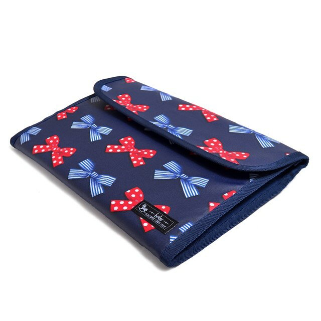 マルチケース/母子手帳ケース(ジャバラタイプ) ポルカドットとストライプのフレンチリボン(ネイビー)【母子手帳カバー 母子手帳入れ】(赤ちゃん ベビー 出産祝い男の子 女の子 リボン)